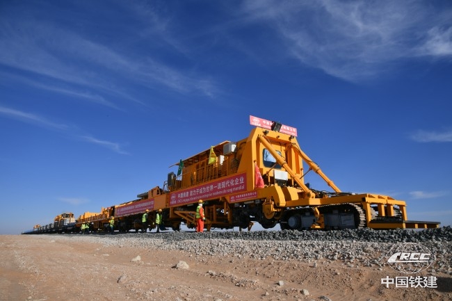 為攻克難題,項(xiàng)目團(tuán)隊(duì)創(chuàng)新采用“機(jī)械化集群作業(yè)+智能監(jiān)測(cè)”施工模式,投入70余臺(tái)(套)適配沙漠環(huán)境的專用施工設(shè)備,推行24小時(shí)雙班鋪軌循環(huán)作業(yè),成功創(chuàng)下單日最高4.225公里以及日均鋪軌3.5公里的沙漠鐵路施工紀(jì)錄。