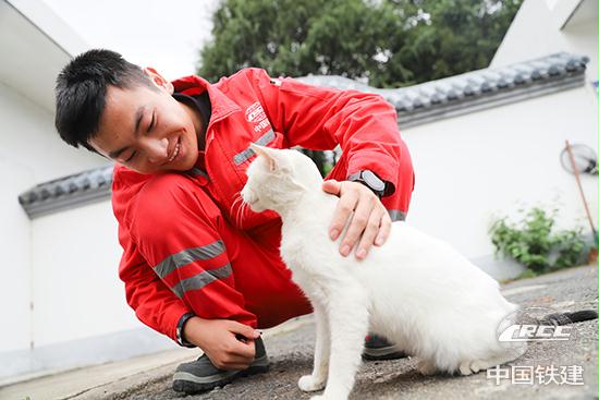 下班后的維管人員陳輝在逗岸邊撿來的小貓